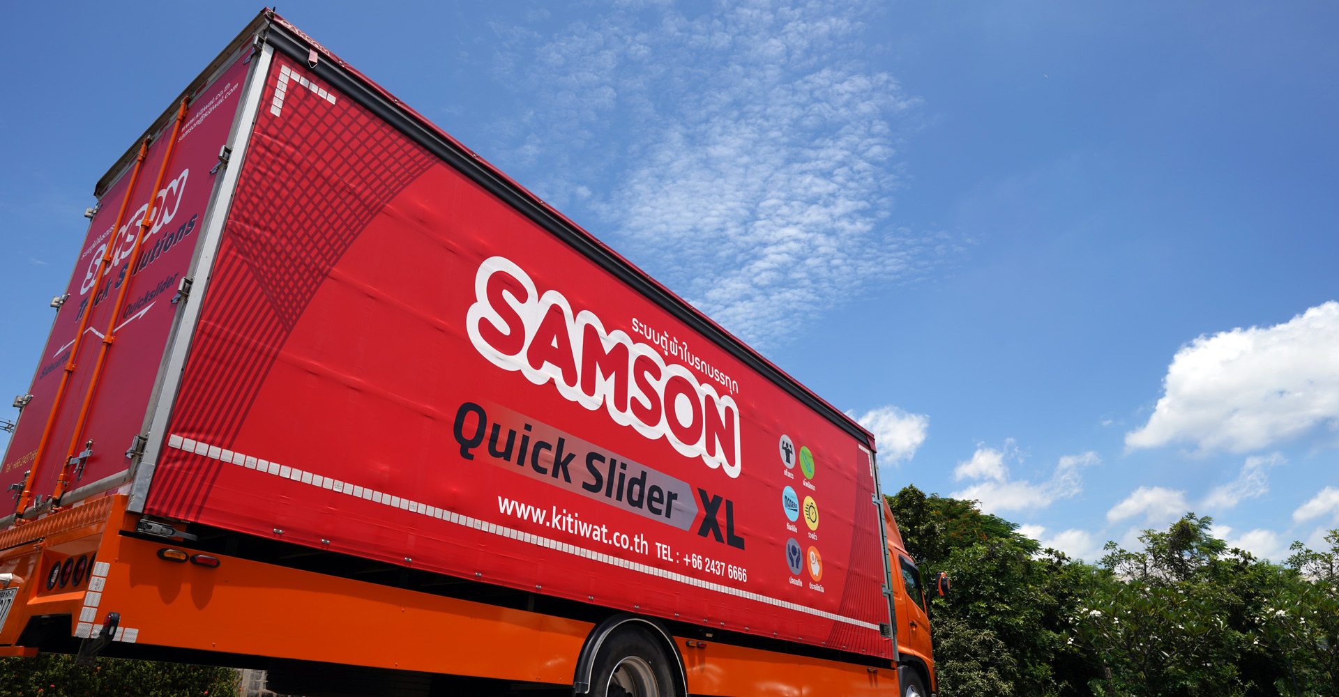 ผ้าม่านรถบรรทุกจาก SAMSON เหนือกว่าระบบผ้าม่านทั่วไปด้วย SAMSON Safety Roller ได้มาตรฐาน DEKRA จากประเทศเยอรมนี ทำงานร่วมกันได้เป็นอย่างดี รับแรงได้สูง เพิ่มความลื่นไหลในการเปิด-ปิดและความแข็งแรงในการใช้งาน